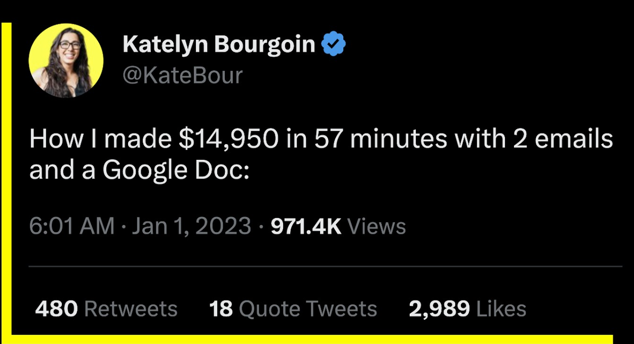 For example, Katelyn Bourgoin (who was on episode 5 of Marketing Powerups) taps into our curiousity of how she made $14,950 with just two emails and a Google Doc: